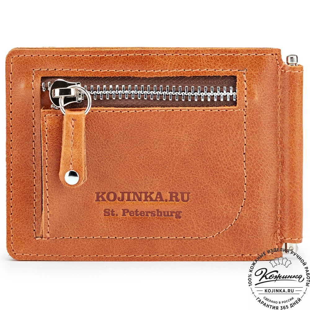 Зажим представляет собой обложку из качественной натуральной кожи для денежных купюр. Купюры удерживаются в обложке с помощью металлического зажима удобной конструкции.