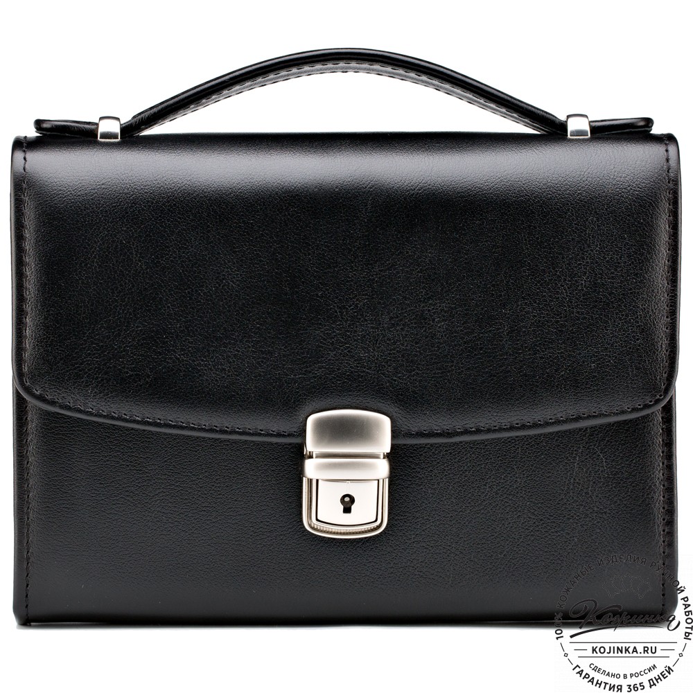 Барсетка закрывается клапаном на портфельный замок. Имеет удобную кожаную ручку и съемную ручку-петлю в комплекте.