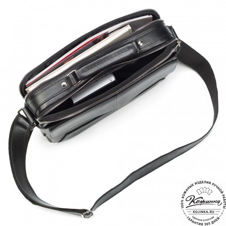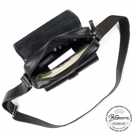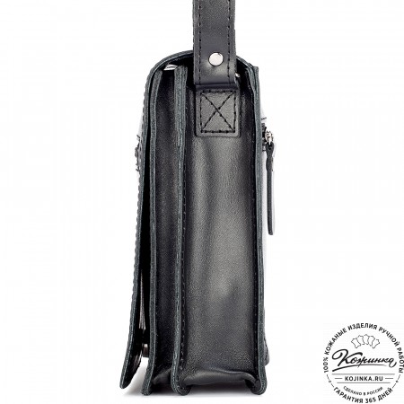 Удобный плечевой ремень регулируется по длине пряжкой. Свободный конец ремня фиксируется кожаным кольцом.