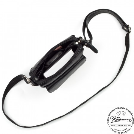 Плечевой ремень и ручка выполнены из кожи. Ремень съемный, регулируется по длине, крепится на небольшие карабины.