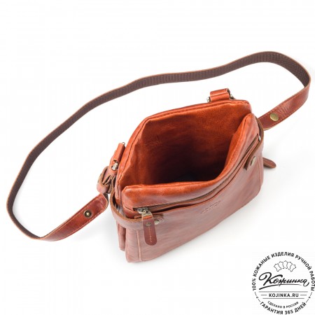 Плечевой ремень кожаный, усилен стропой для прочности. Ремень удобно регулируется по длине.