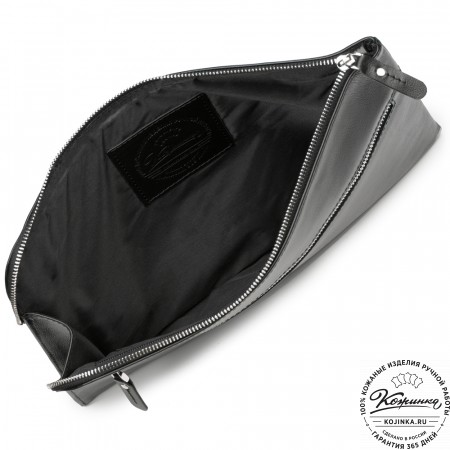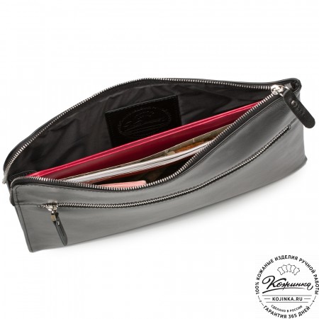 Папка закрывается на молнию. Благодаря боковой складке папка широко открывается. Внутри карман на молнии и два небольших открытых кармана.
