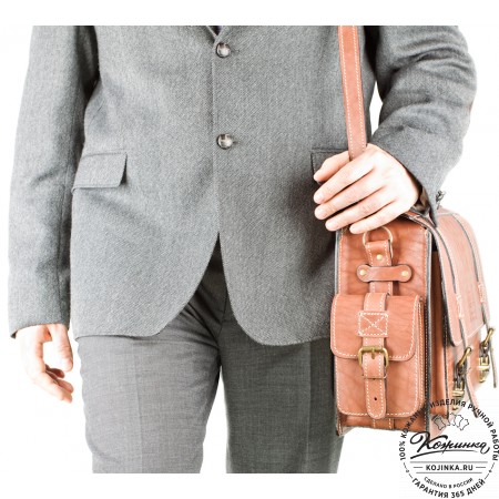 Удобная крепкая кожаная ручка и кожаный ремень с наплечником. Ремень съемный, регулируется по длине.