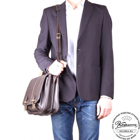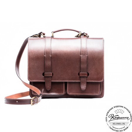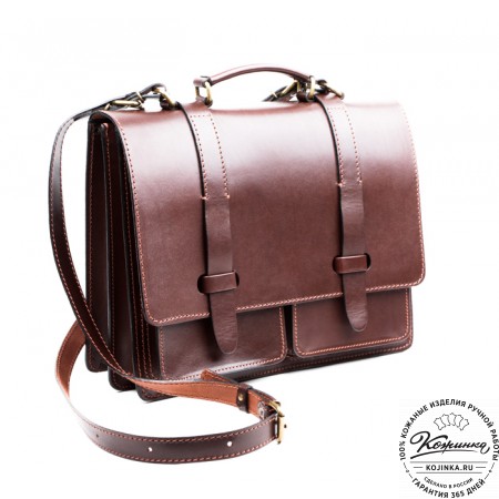 Портфель из 100% натуральной толстой кожи, закрывается на одну пряжку с регулируемой длиной. Сверху конструкция укреплена жёсткой толстой кожей. Внутри два удобных отдела разделённых перегородкой с карманом на молнии. В переднем отделении есть дополнительный малый карман на молнии. На задней стенке имеется один накладной кожаный карман и второй карман на молнии - для быстрого доступа.