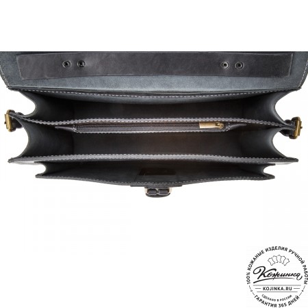 Внутри два объёмных отделения, между ними карман-перегородка на молнии.