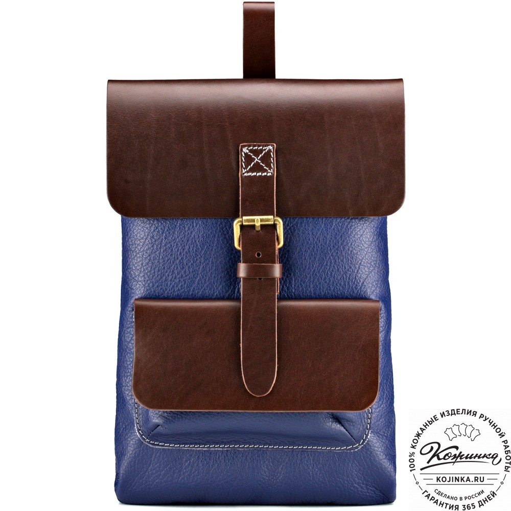 Сочетание фактурной кожи cинего цвета с гладкой коричневой кожей на клапане, кармане и лямках рюкзака - именно это делает Грэй таким интересным!