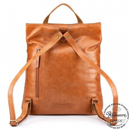 Лямки рюкзака из кожи, усилены стропой, регулируются по длине. Лямки можно соединить вмести молнией и удобно носить рюкзак на одно плечо.