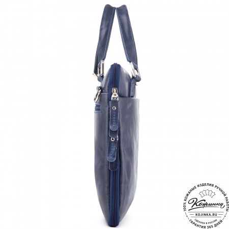 На модели представлен портфель "Арамис" из кожи Антик синего цвета.